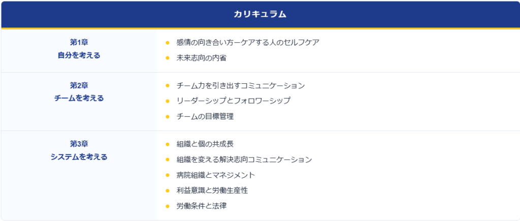 医療マネジメント認定士で学ぶ3つの視点を軸にした全カリキュラムです。